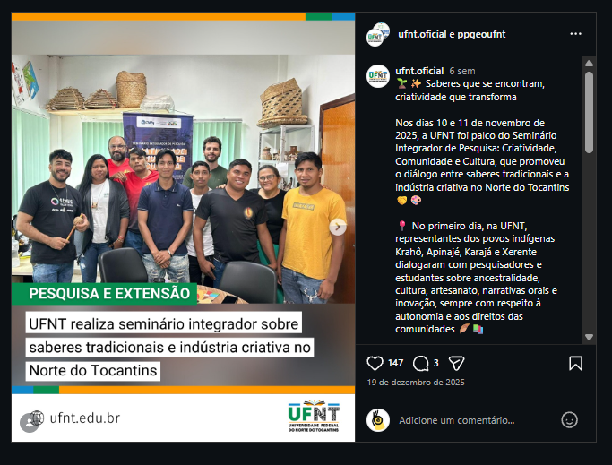 Este post foi publicado originalmente na página oficial da UFNT e PPGGEO no Instagram. Disponível em: https://www.instagram.com/p/DSdBl3DgMbe/?igsh=bXoybGxlZTM5Nm5k.