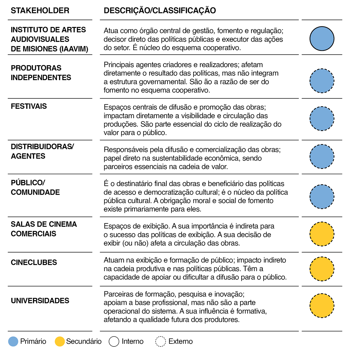 O mapa de stakeholders identifica quais atores compõem o setor audiovisual de Misiones e qual o papel de cada um. Ele representa instituições, organizações, coletivos e grupos profissionais — não indivíduos isolados.