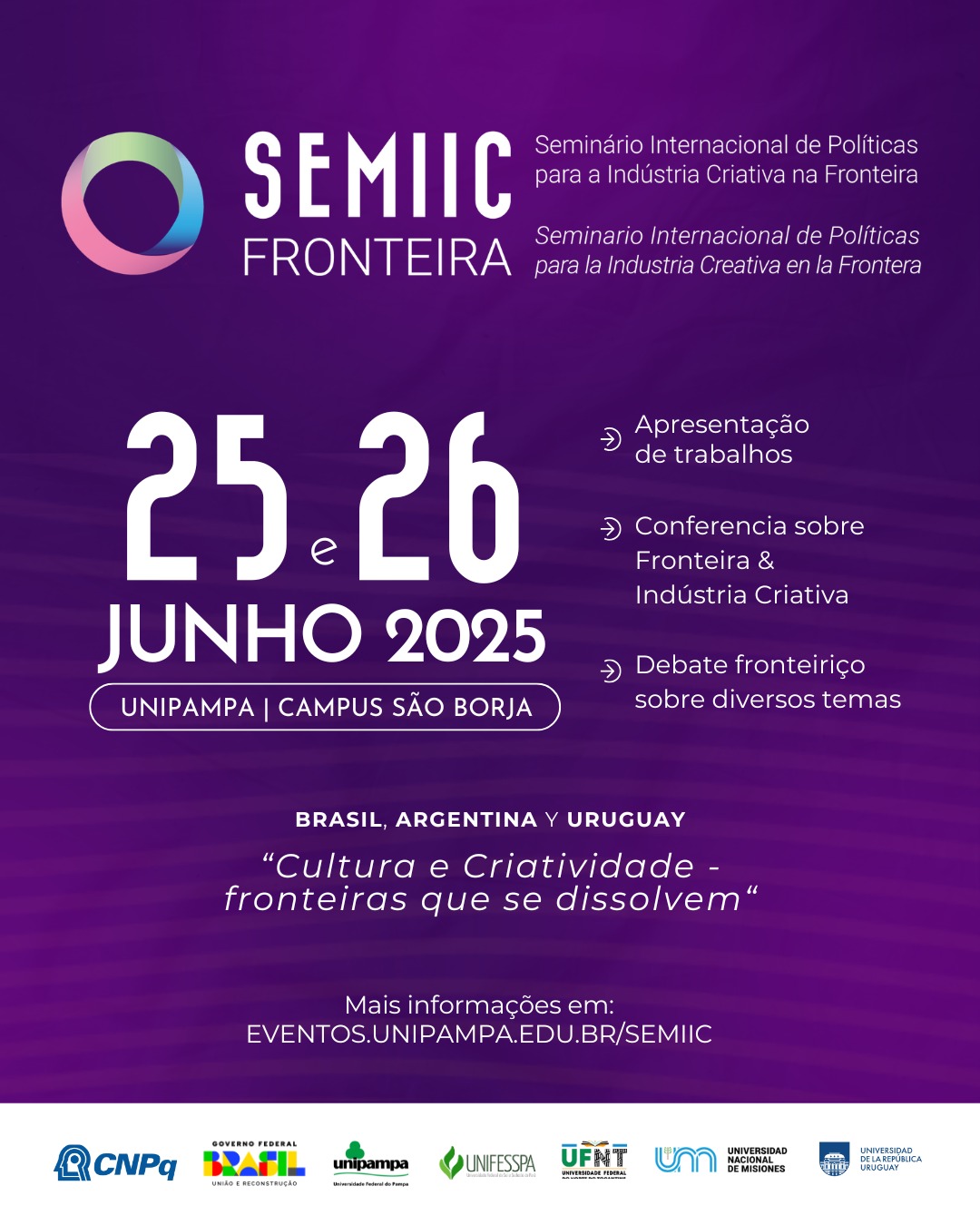 O SEMIIC integra as atividades do projeto de pesquisa financiado pelo CNPq – “Indústria Criativa – Brasil, Argentina e Uruguai”, por meio da Chamada Pública MCTI/CNPq nº 14/2023 (processo nº 441861/2023-7). A ação é desenvolvida no âmbito de internacionalização do Programa de Pós-Graduação em Políticas Públicas (PPGPP) da Unipampa, com apoio do Grupo de Pesquisa Processos e Práticas nas Atividades Criativas e Culturais (GPAC/CNPq) e do Programa de Pós-Graduação em Ciências Humanas (PPGCH).