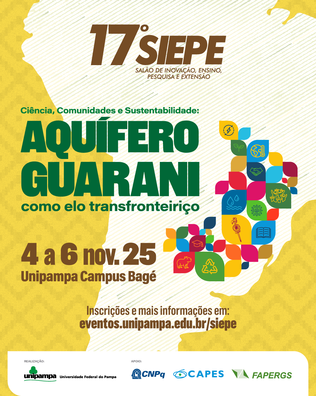 O 17º Salão de Inovação, Ensino, Pesquisa e Extensão (SIEPE) da Universidade Federal do Pampa convida a comunidade acadêmica e da região a refletir sobre as conexões entre conhecimento, território e preservação, por meio do tema “Ciência, Comunidades e Sustentabilidade: Aquífero Guarani como elo transfronteiriço”.
